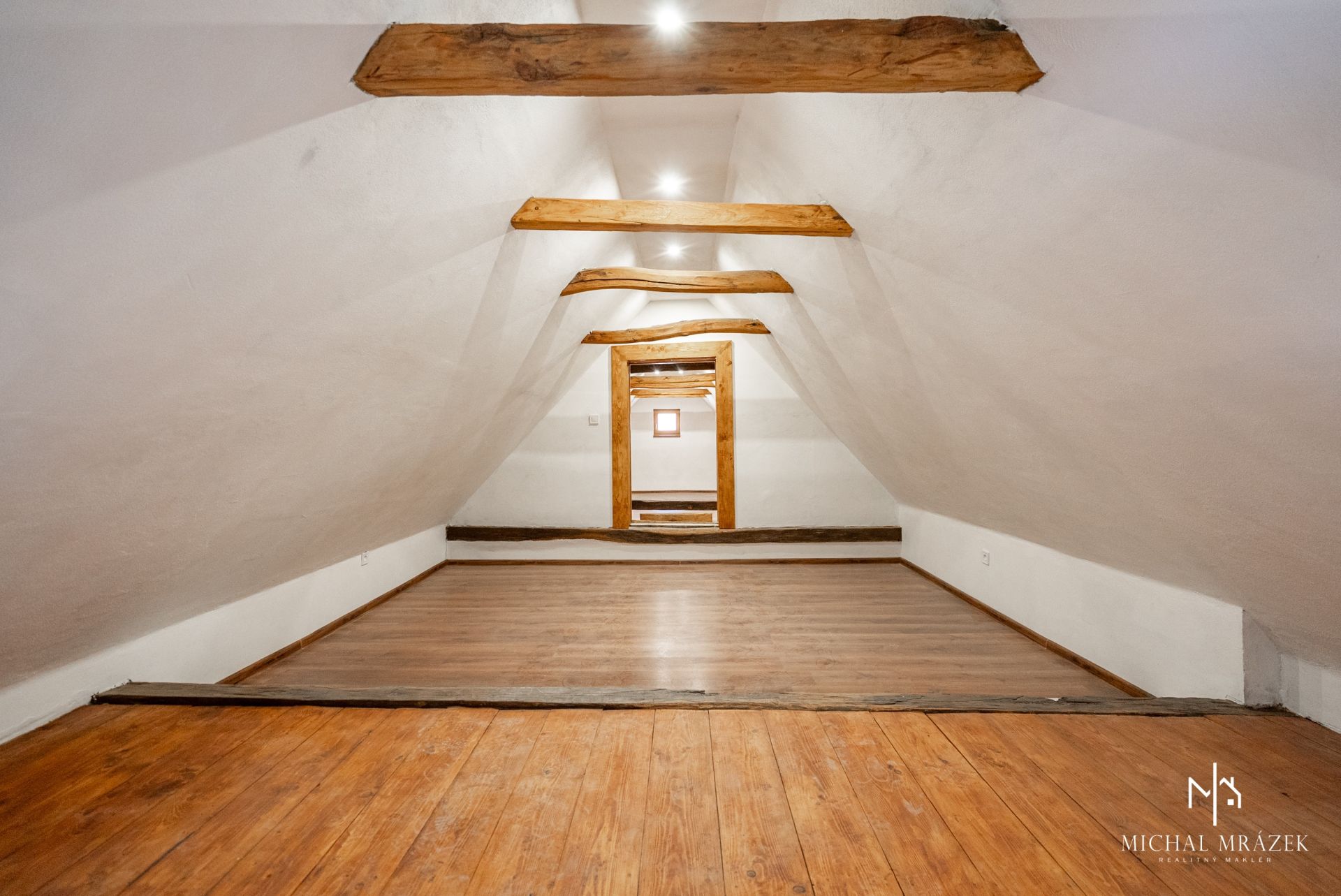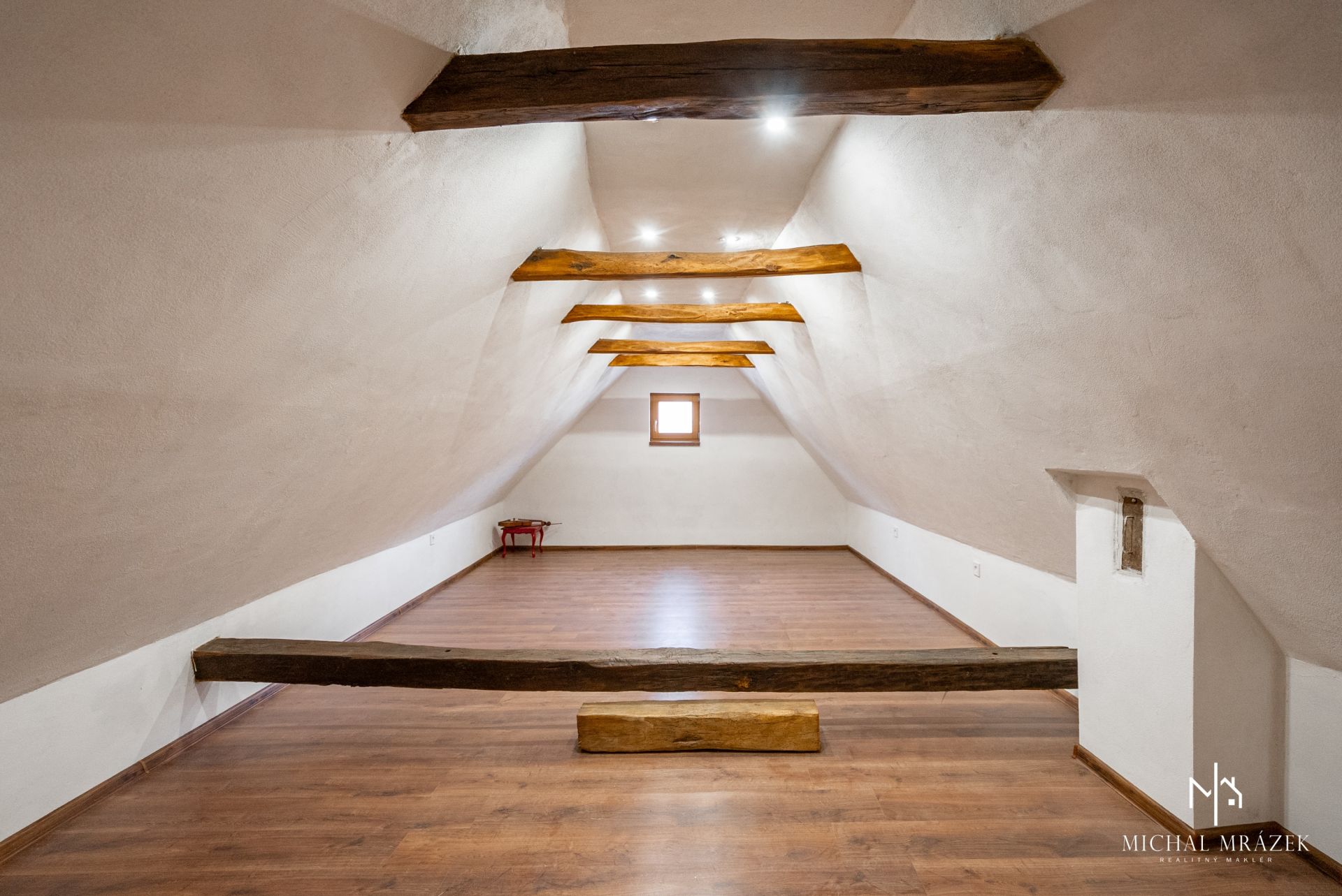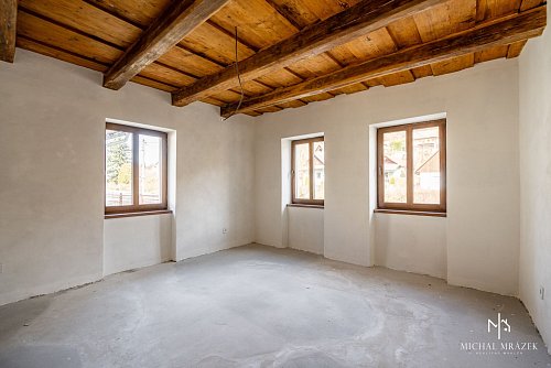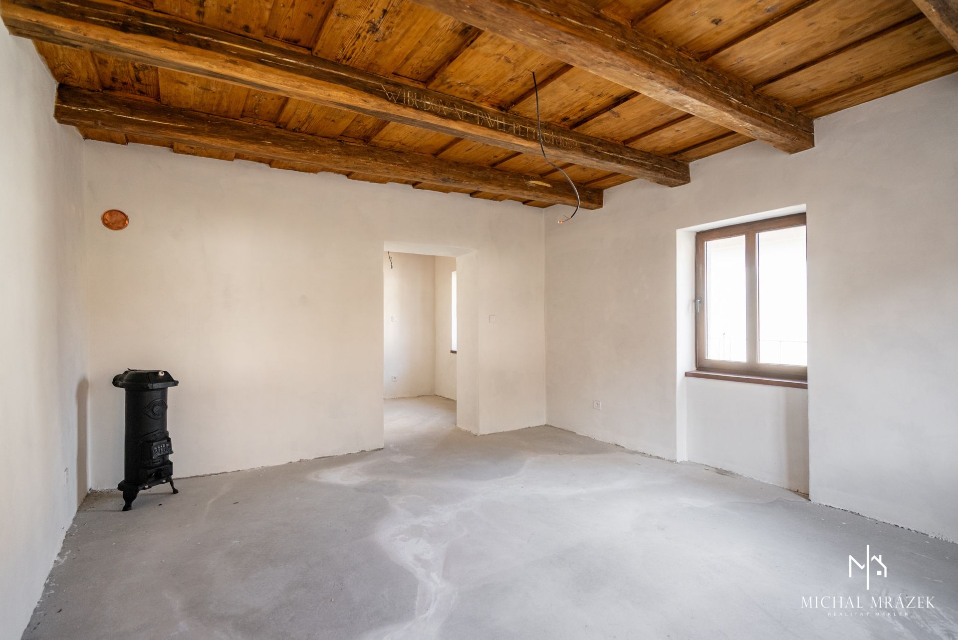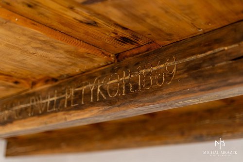 Interiér si zachoval aj pôvodné prvky, najmä drevené stropy, ktoré